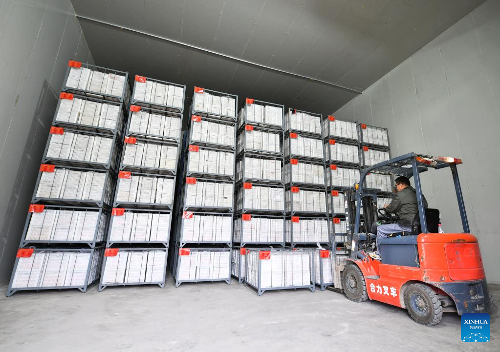 A staff member transfers packed apples in a cold storage facility in Nangou Village of Yan'an, northwest China's Shaanxi Province, Oct. 27, 2022. Covering an area of 24 square kilometers, the Nangou Village is home to more than 1,000 villagers. Led by the village's Party branch, Nangou has worked out ways to inject vitality into the countryside. It has witnessed the boom of planting and breeding industries and rural tourism. Villagers have constantly increased their income by earning dividends and taking odd jobs during the slack farming season. (Xinhua/Zhang Bowen)