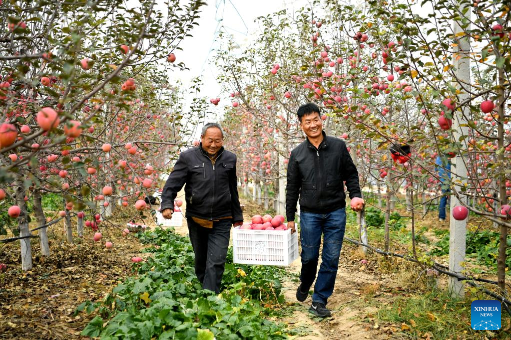 Fruit farmers carry apples in an orchard in Nangou Village of Yan'an, northwest China's Shaanxi Province, Oct. 27, 2022. Covering an area of 24 square kilometers, the Nangou Village is home to more than 1,000 villagers. Led by the village's Party branch, Nangou has worked out ways to inject vitality into the countryside. It has witnessed the boom of planting and breeding industries and rural tourism. Villagers have constantly increased their income by earning dividends and taking odd jobs during the slack farming season. (Xinhua/Zhang Bowen)