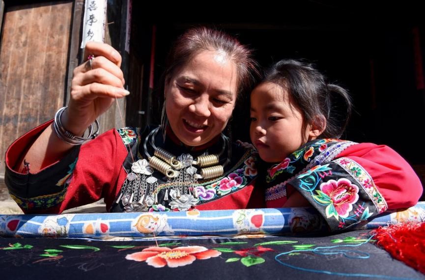 A woman teaches a girl to make Miao embroidery in Dawan village, Panxin township, Songtao Miao autonomous county, Tongren, southwest China's Guizhou Province, Oct. 23, 2022. (People's Daily Online/Long Yuanbin)