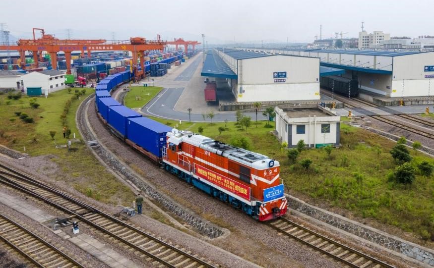 The first China-Europe freight train between Jinhua, east China's Zhejiang Province and Italy's Milan departs from Jinhua, carrying cloths, ironware and stationary, May 21, 2022. (People's Daily Online/Hu Xiaofei)