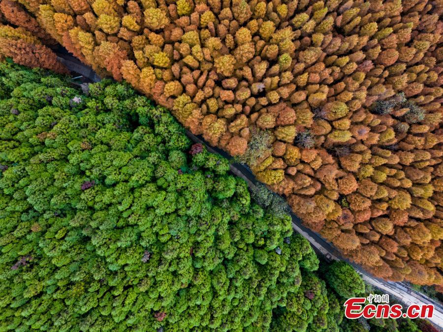 Aerial view shows the unique autumn scenery in Shanwangping Karst National Ecological Park in Chongqing. Leaves of the dawn redwood trees turned orange and red, while the Japanese cedar remained green, splitting the forest into two pallets of color. (Photo: China News Service/He Penglei)