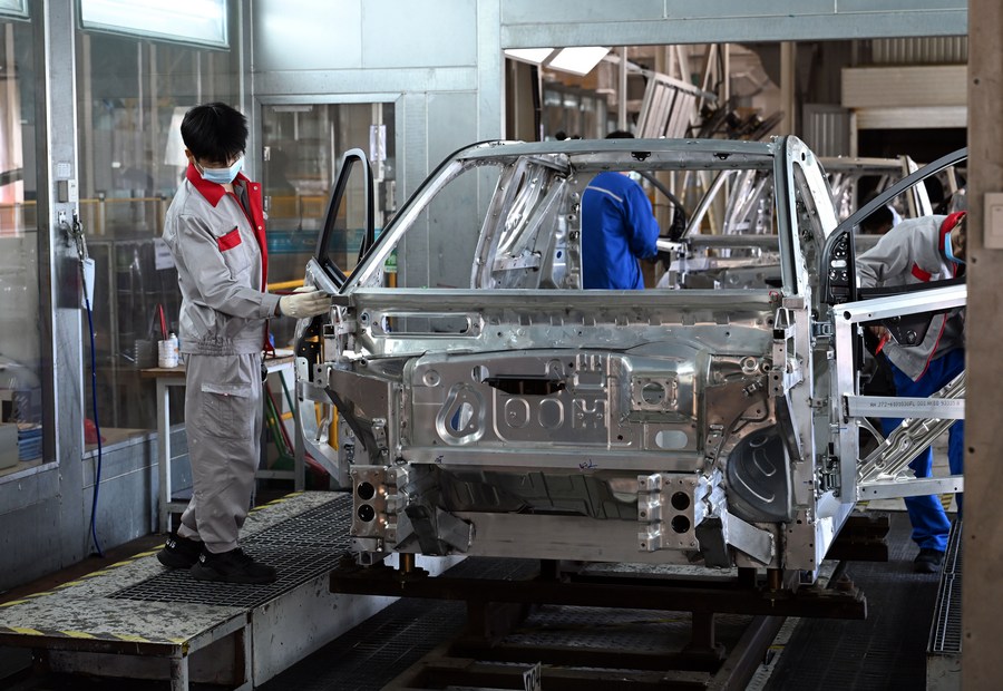 Workers are busy on the production line of new energy vehicles (NEVs) at a factory of Chinese automaker Chery Holding Group Co., Ltd. in Wuhu City, east China's Anhui Province, Oct. 12, 2022. (Xinhua/Zhou Mu)