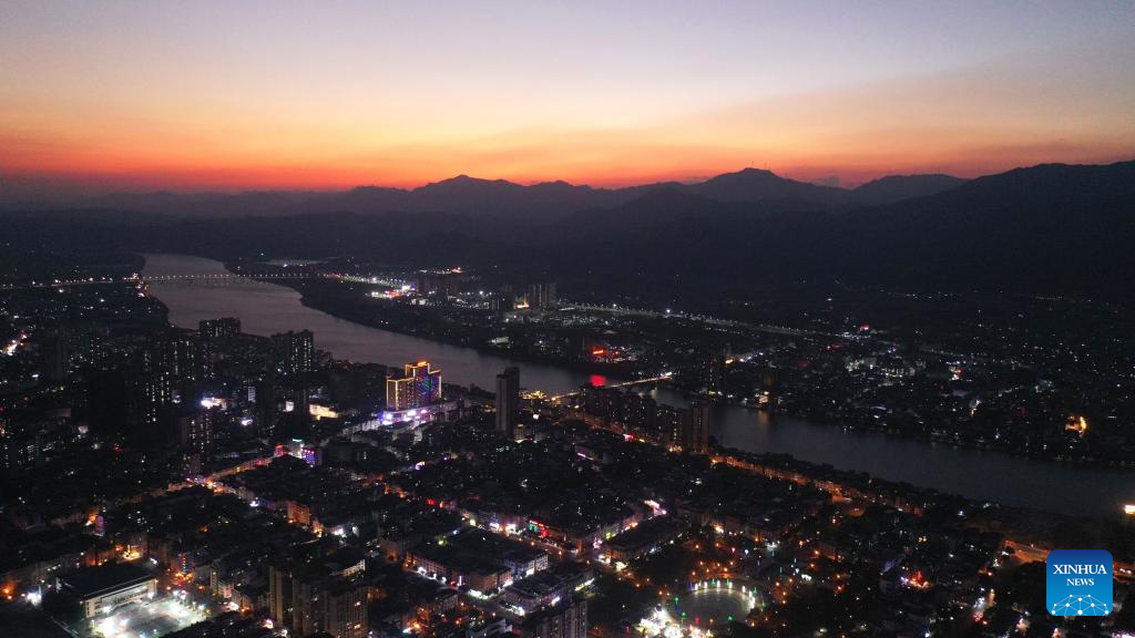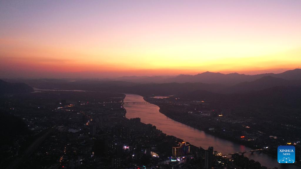 This aerial photo taken on Oct. 31, 2022 shows the sunset glow over the Rongjiang River in Rong'an County, south China's Guangxi Zhuang Autonomous Region. (Xinhua/Huang Xiaobang)