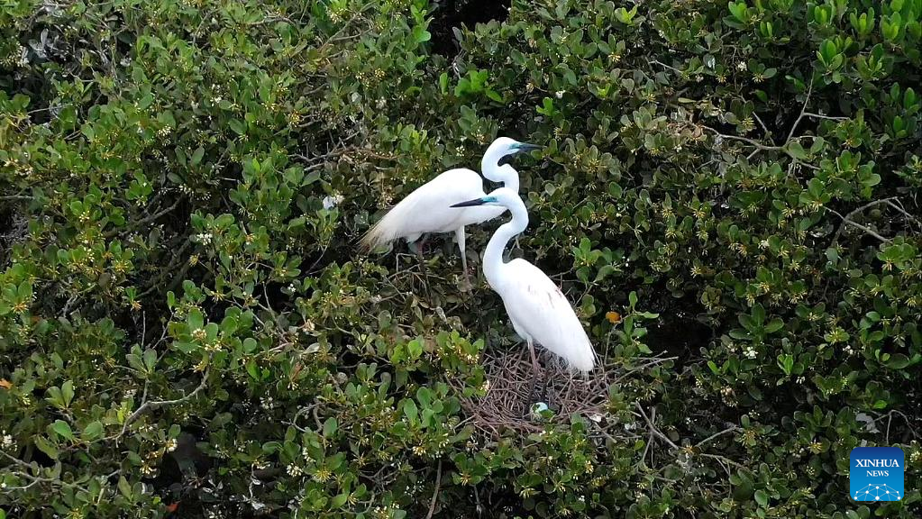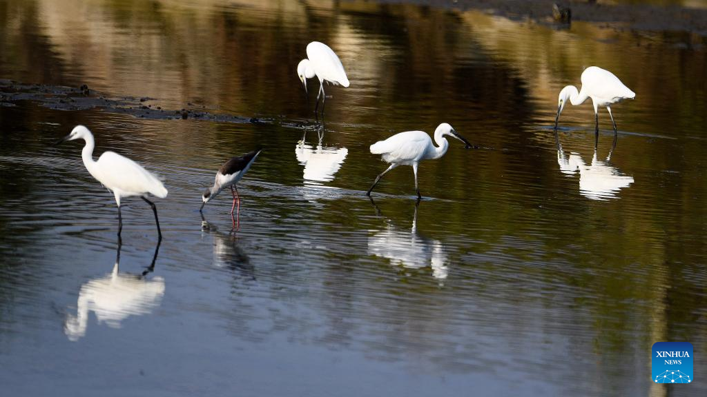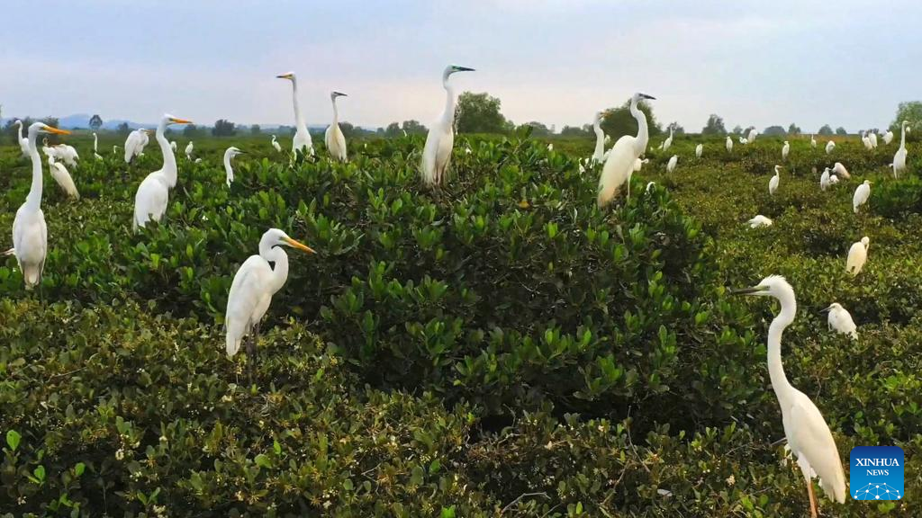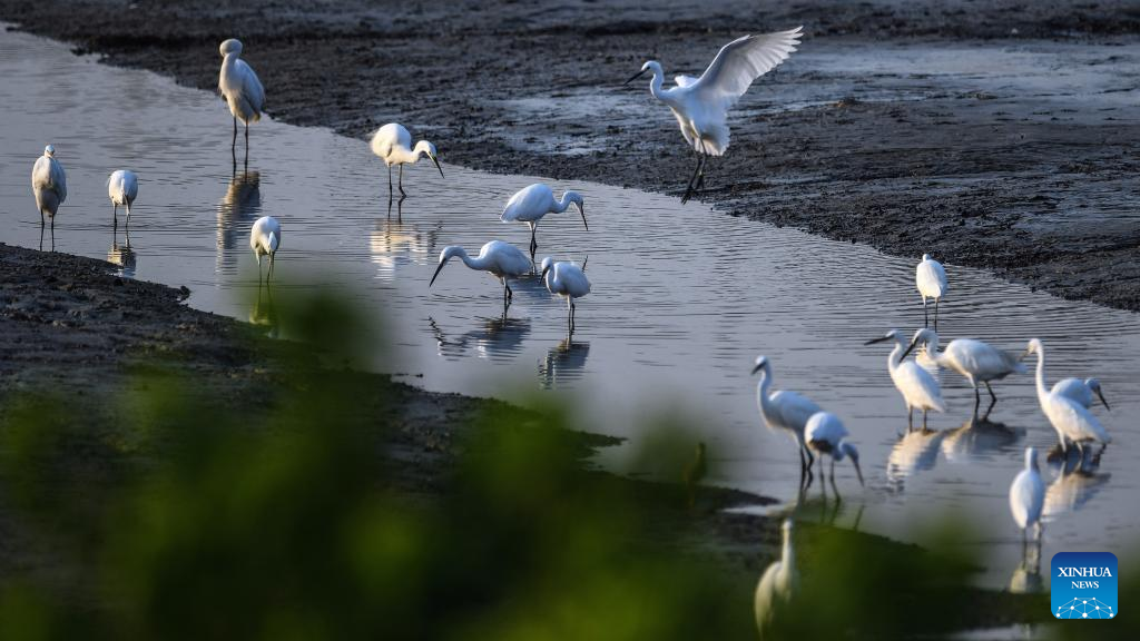 Birds are seen in Shankou Mangrove Nature Reserve in Hepu County of Beihai City, south China's Guangxi Zhuang Autonomous Region, Oct. 23, 2022. The Shankou Mangrove Nature Reserve, a wetland reserve protecting the ecosystem of the mangrove forest, has been designated as a wetland of international importance in China. (Xinhua/Zhang Ailin)