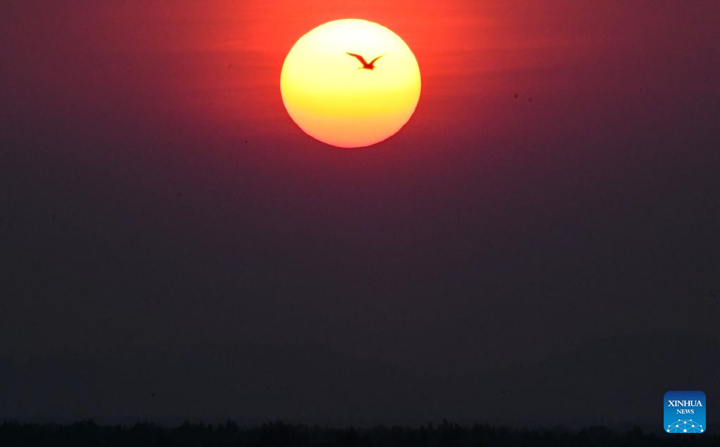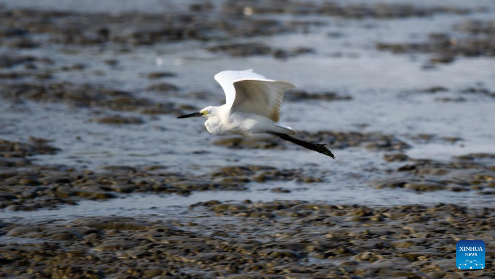 A bird is seen flying in Shankou Mangrove Nature Reserve in Hepu County of Beihai City, south China's Guangxi Zhuang Autonomous Region, Oct. 23, 2022. The Shankou Mangrove Nature Reserve, a wetland reserve protecting the ecosystem of the mangrove forest, has been designated as a wetland of international importance in China. (Xinhua/Zhang Ailin)