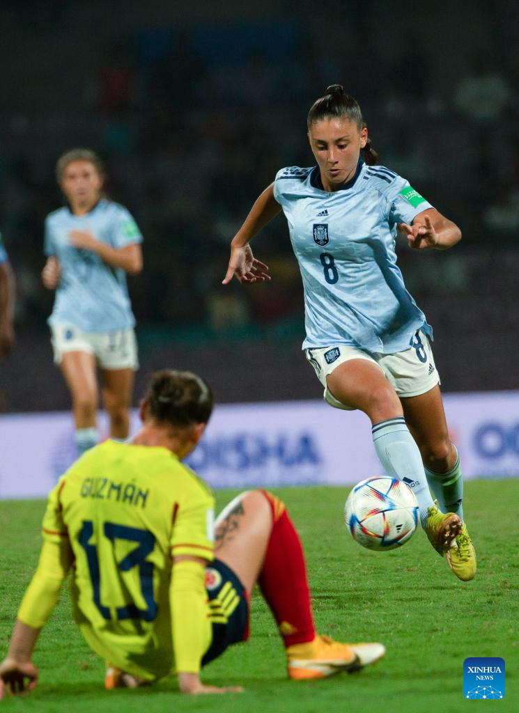 Olaya Enrique (R) of Spain controls the ball during the FIFA U17 Women's football World Cup final between Colombia and Spain in Navi Mumbai, India, Oct. 30, 2022. (Xinhua/Javed Dar)