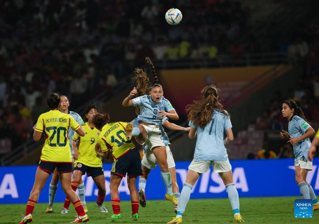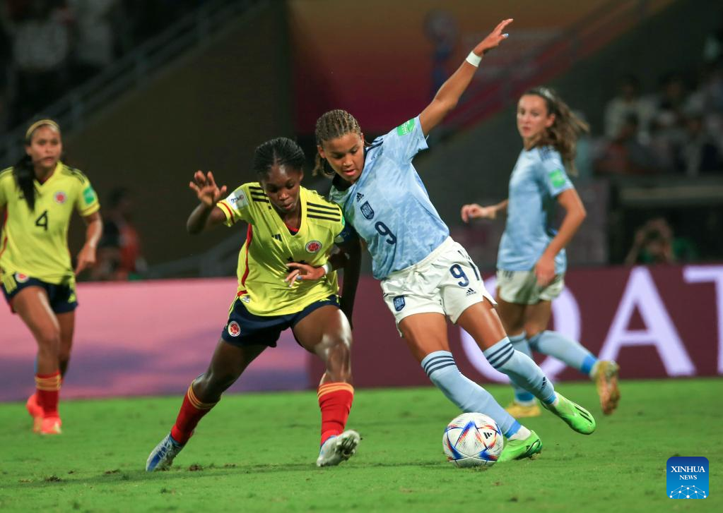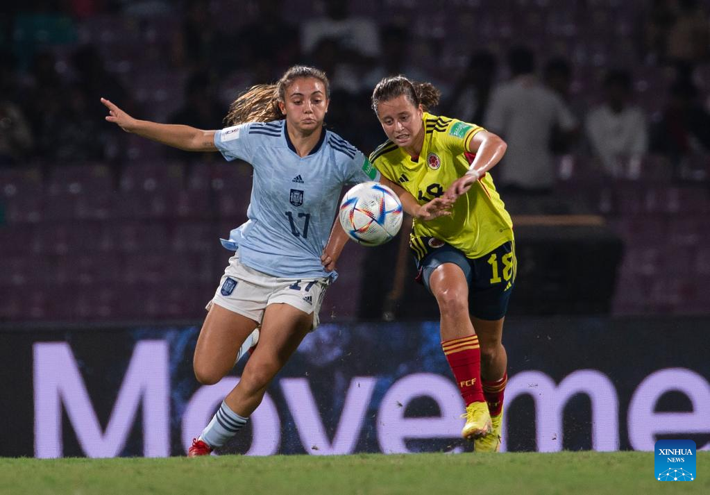 Vicky Lopez (R, front) of Spain vies with Linda Caicedo of Colombia during their FIFA U17 Women's football World Cup final in Navi Mumbai, India, Oct. 30, 2022. (Xinhua/Javed Dar)