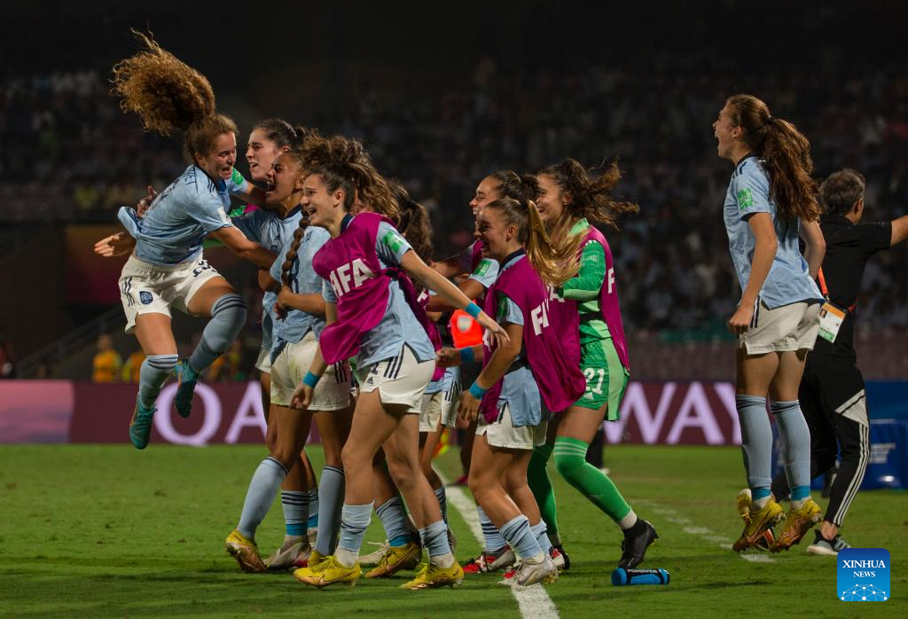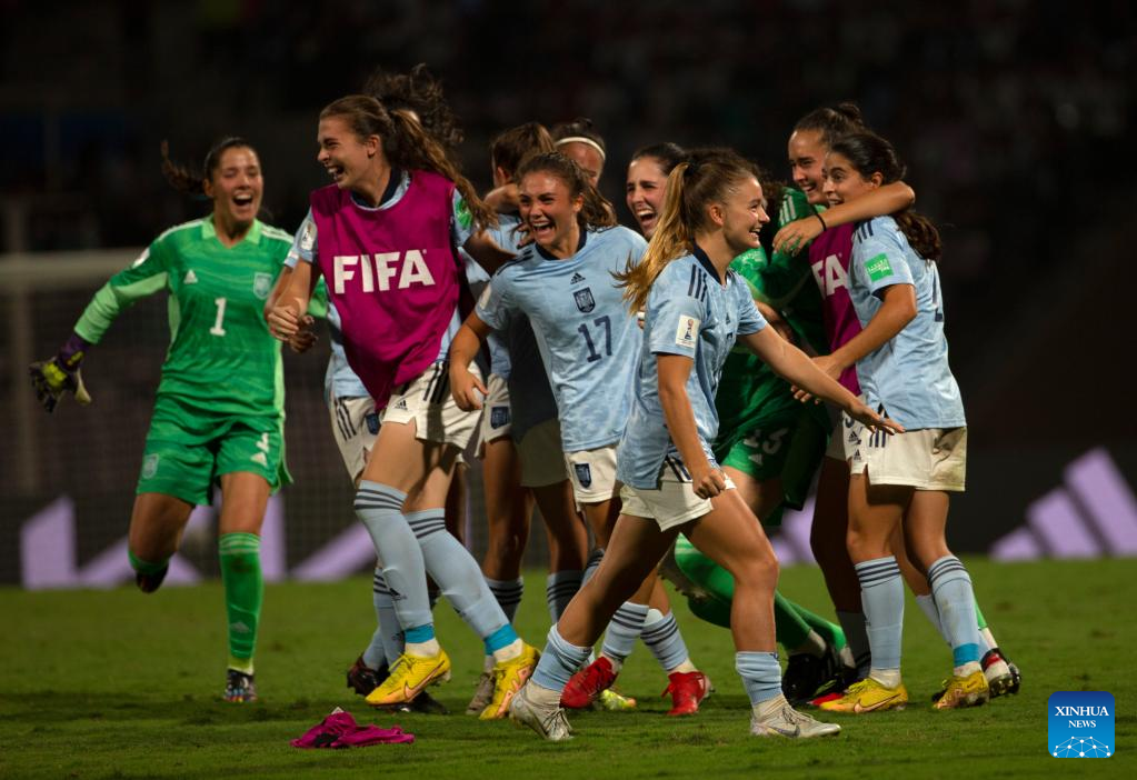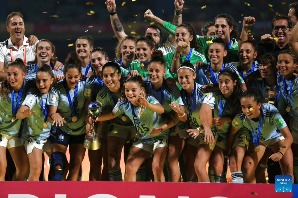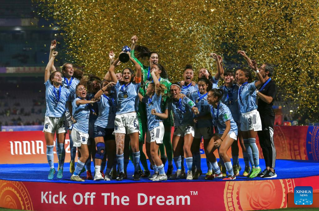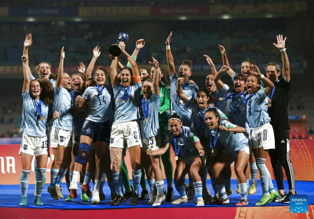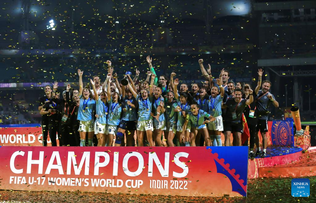 Players of Spain celebrate after winning the FIFA U17 Women's football World Cup final between Colombia and Spain in Navi Mumbai, India, Oct. 30, 2022. (Xinhua/Javed Dar)