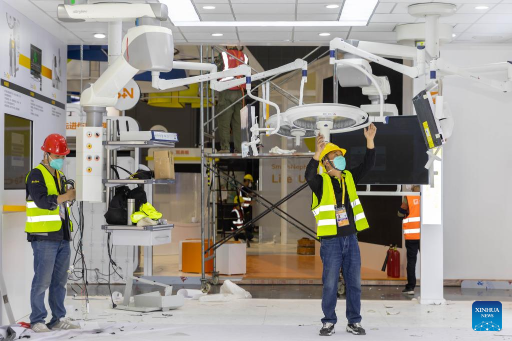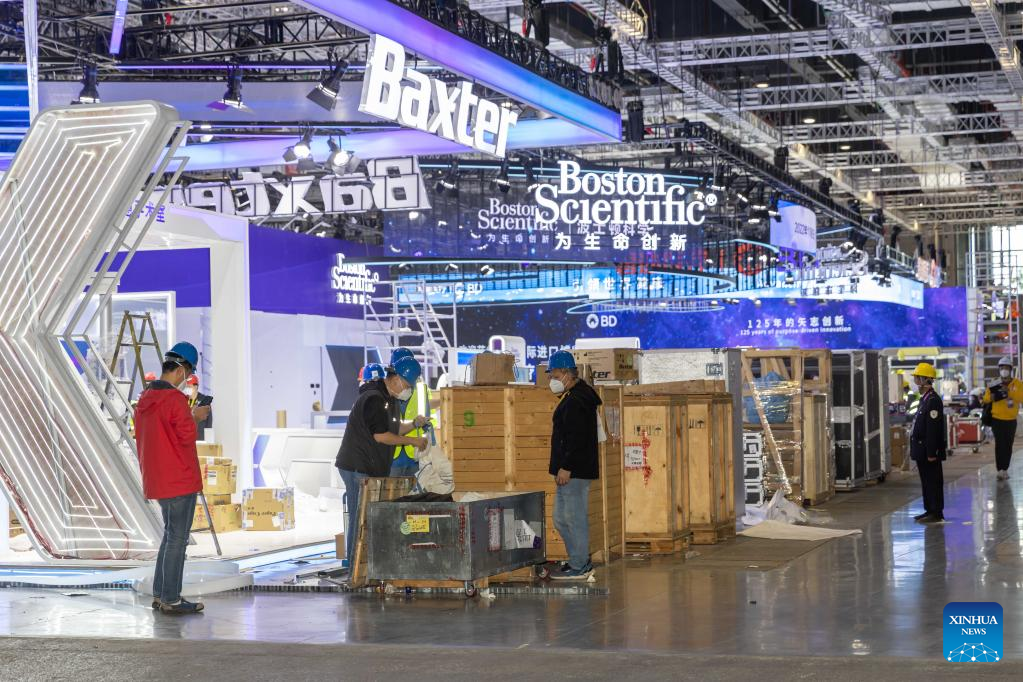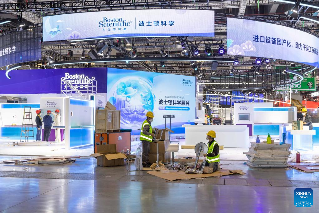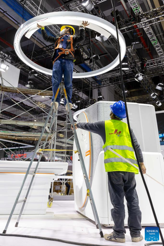 Workers set up an exhibition booth at the National Exhibition and Convention Center (Shanghai), the main venue for the upcoming fifth China International Import Expo (CIIE), in east China's Shanghai, Oct. 31, 2022. The fifth CIIE will be held in Shanghai from Nov. 5 to 10. (Xinhua/Wang Xiang)
