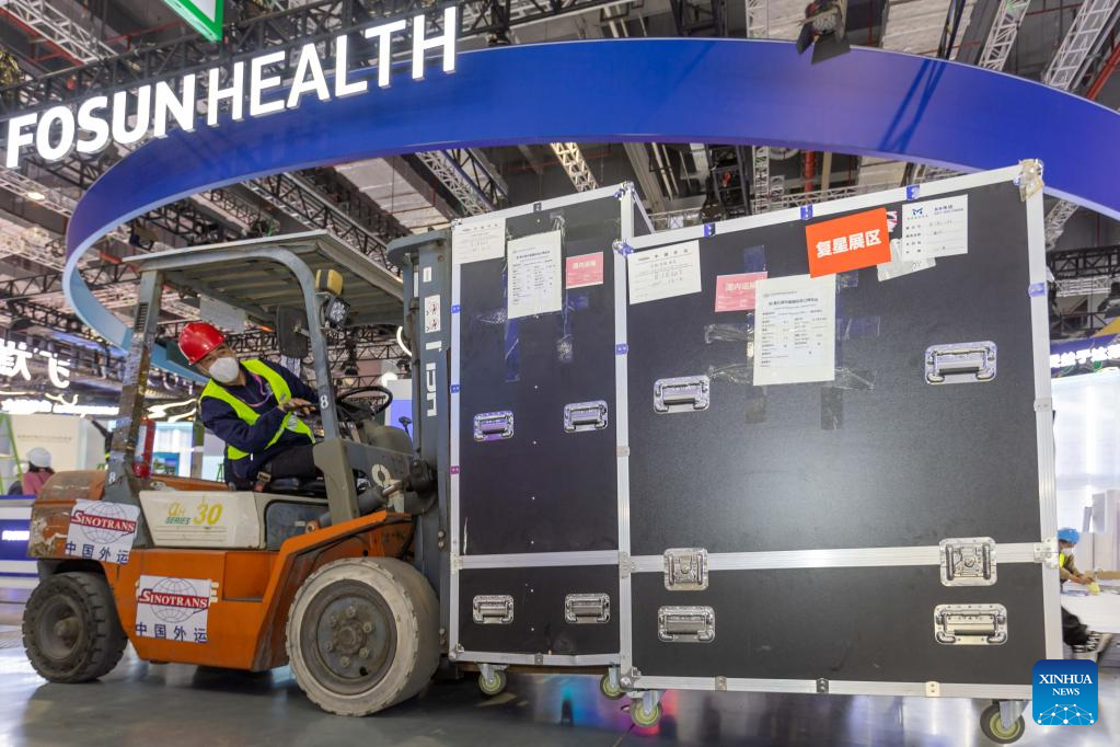 A worker transfers exhibits at the National Exhibition and Convention Center (Shanghai), the main venue for the upcoming fifth China International Import Expo (CIIE), in east China's Shanghai, Oct. 31, 2022.
