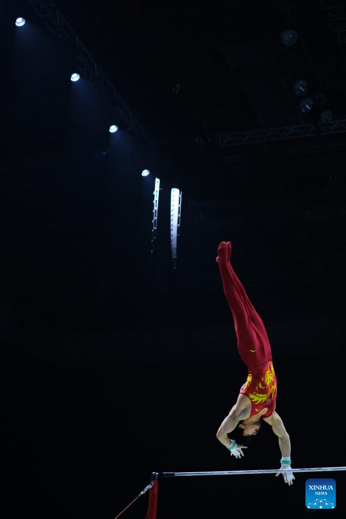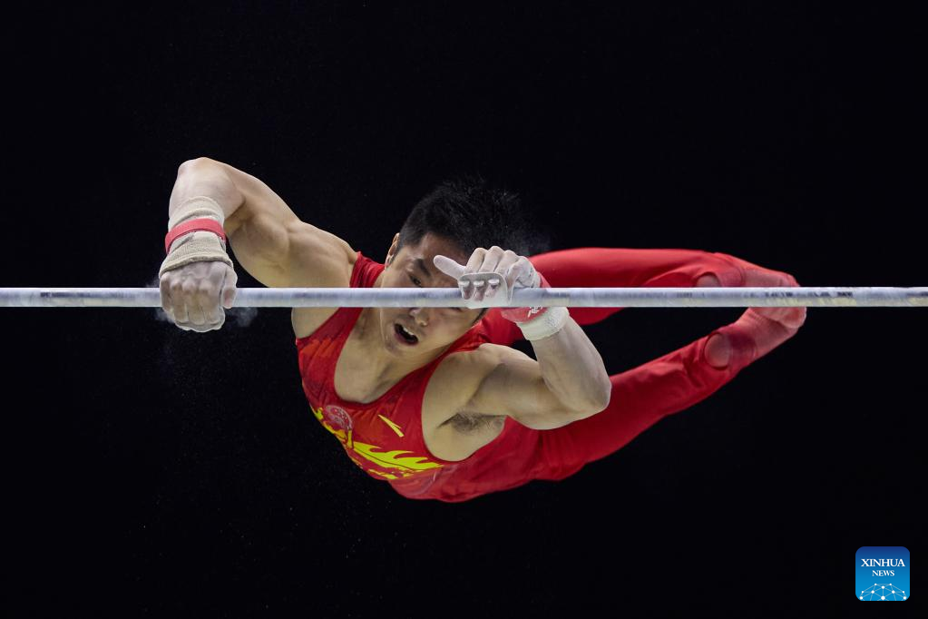 You Hao of China competes in horizontal bar event of men's qualifications at the 51st FIG Artistic Gymnastics World Championships in Liverpool, Britain, Oct. 31, 2022. (Xinhua/Meng Dingbo)