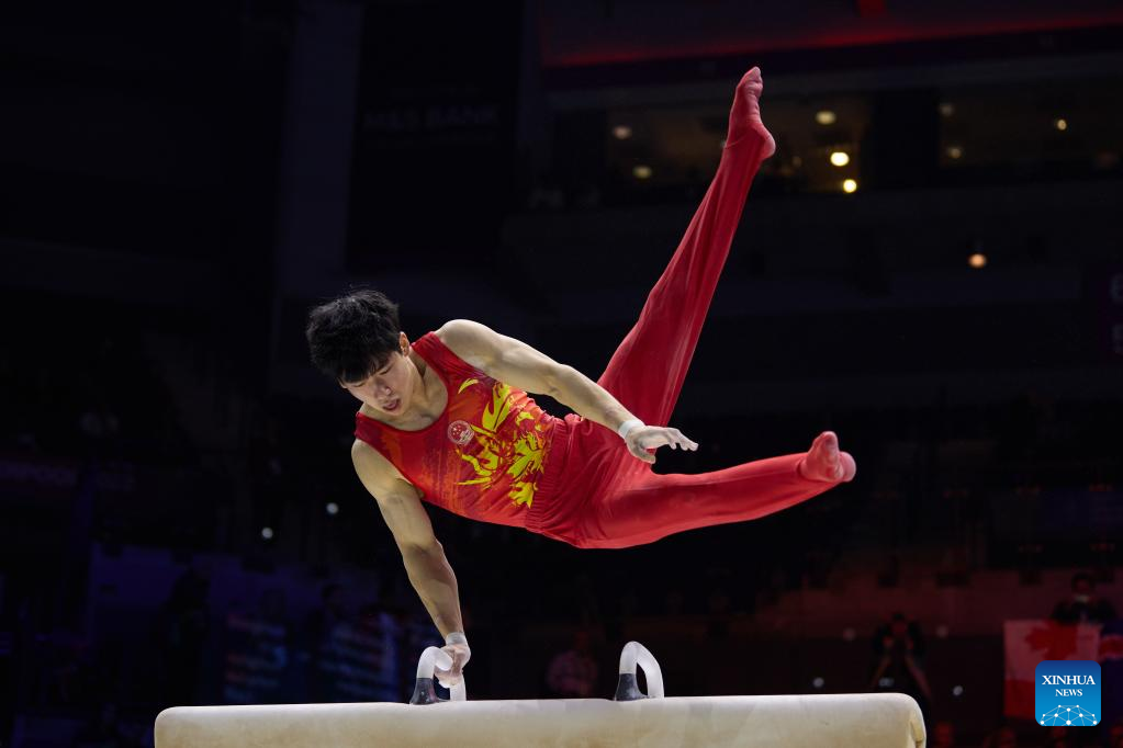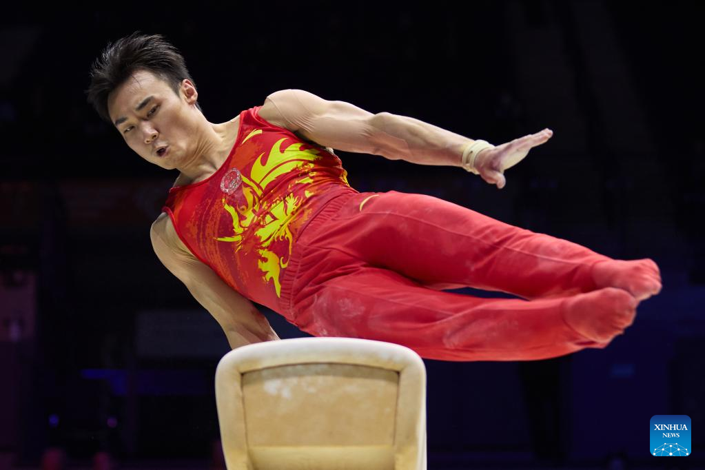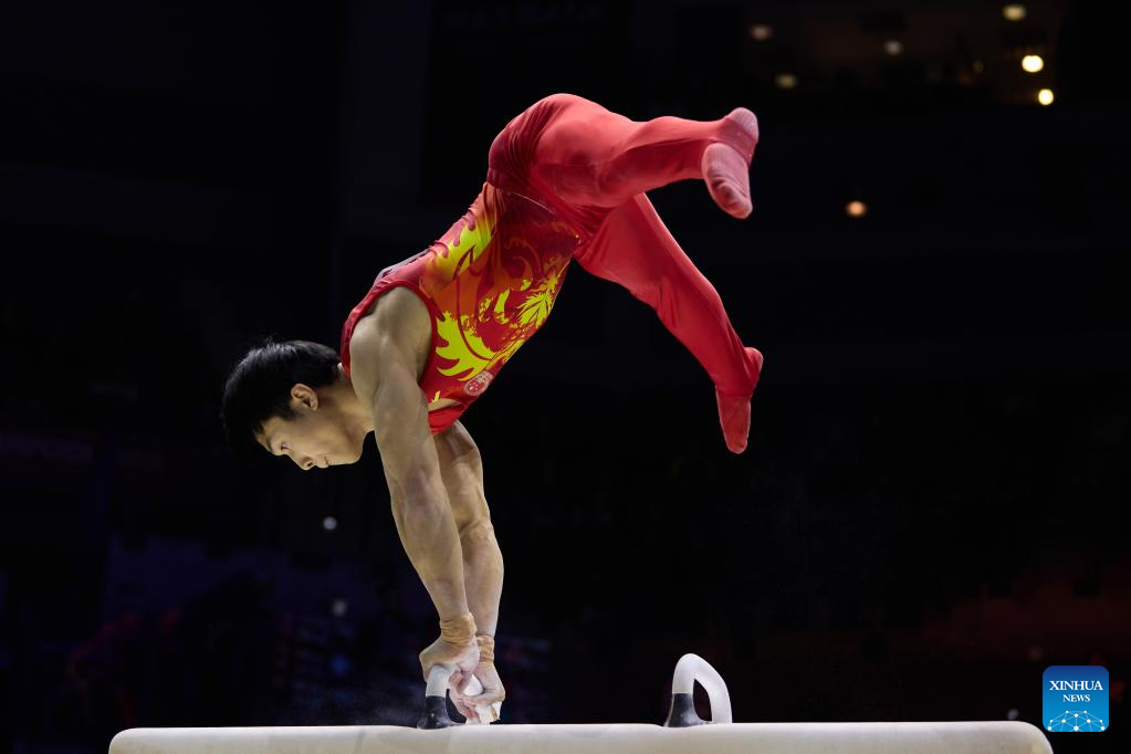 Zhang Boheng of China competes in pommel horse event of men's qualifications at the 51st FIG Artistic Gymnastics World Championships in Liverpool, Britain, Oct. 31, 2022. (Xinhua/Meng Dingbo)