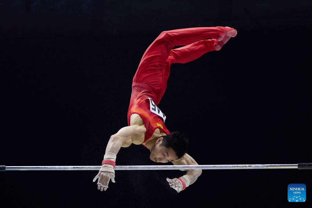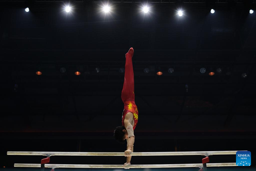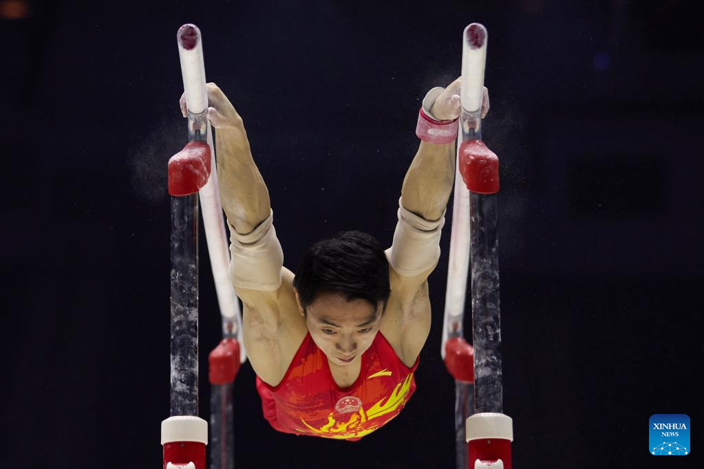 Zhang Boheng of China competes in parallel bars event of men's qualifications at the 51st FIG Artistic Gymnastics World Championships in Liverpool, Britain, Oct. 31, 2022. (Xinhua/Meng Dingbo)