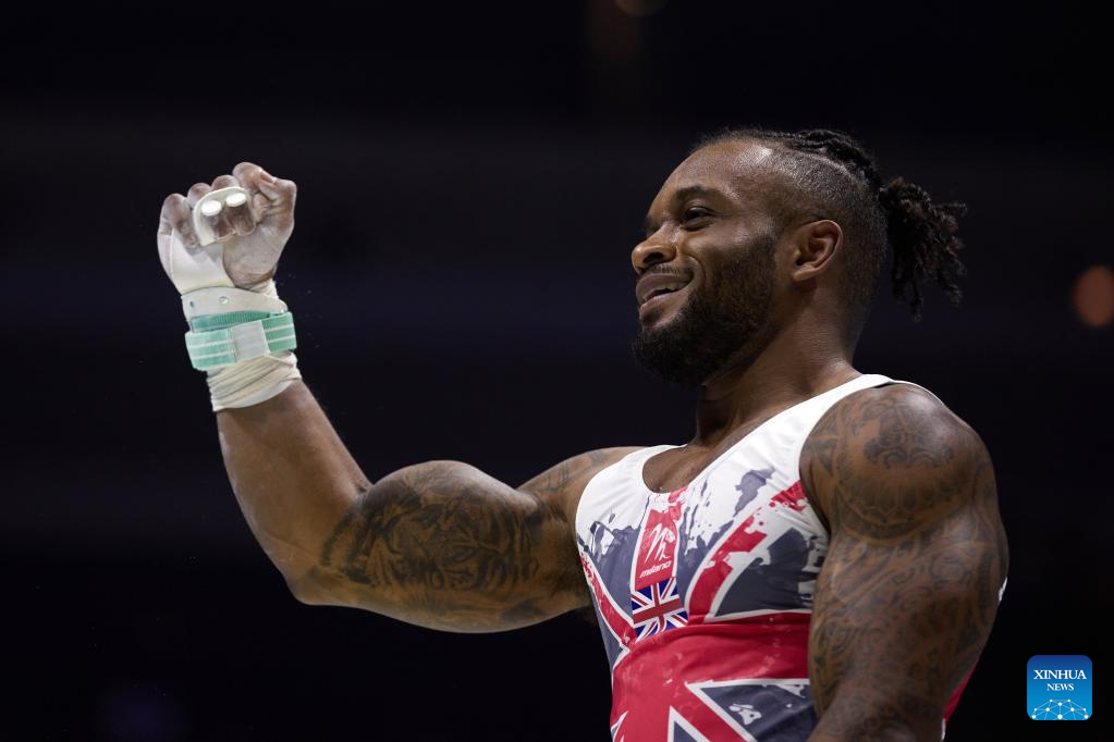 Courtney Tulloch of Britain reacts after rings event of men's qualifications at the 51st FIG Artistic Gymnastics World Championships in Liverpool, Britain, Oct. 31, 2022. (Xinhua/Meng Dingbo)
