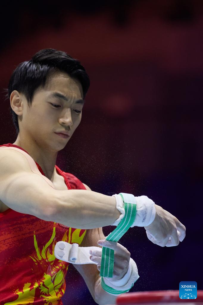 Zou Jingyuan of China prepares before rings event of men's qualifications at the 51st FIG Artistic Gymnastics World Championships in Liverpool, Britain, Oct. 31, 2022. (Xinhua/Meng Dingbo)