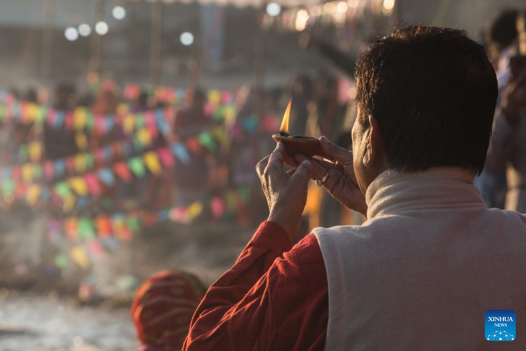 A man worships the rising sun during the Chhath festival on the bank of the Bagmati River in Kathmandu, Nepal, Oct. 31, 2022. The Chhath festival is dedicated to the sun, which is regarded as a token of stability and prosperity, and a Vedic goddess "Chhathi Maiya." (Photo by Hari Maharjan/Xinhua)