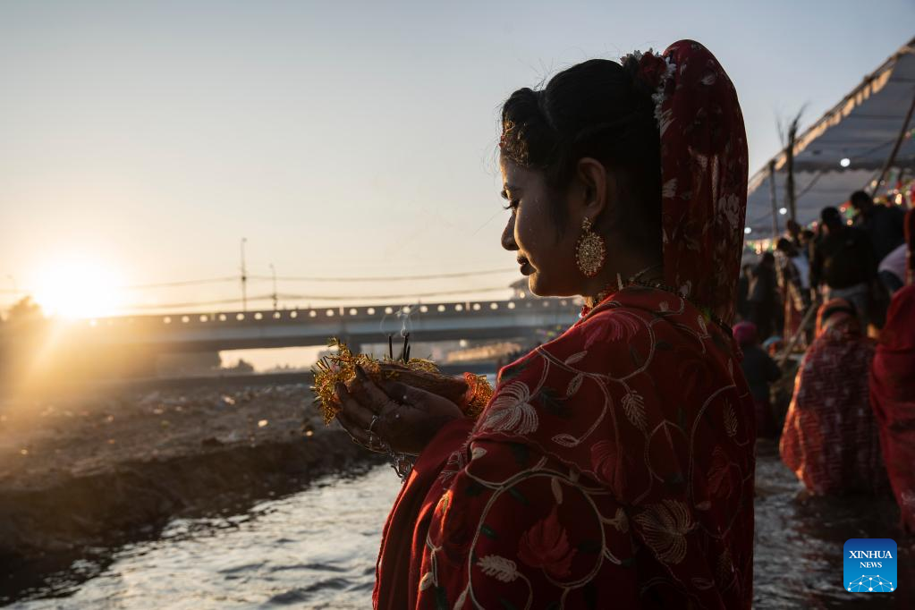 A woman worships the rising sun during the Chhath festival on the bank of the Bagmati River in Kathmandu, Nepal, Oct. 31, 2022. The Chhath festival is dedicated to the sun, which is regarded as a token of stability and prosperity, and a Vedic goddess "Chhathi Maiya." (Photo by Hari Maharjan/Xinhua)