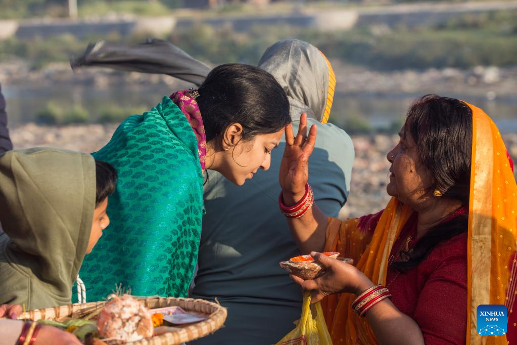 A devotee receives tika on her forehead after worshipping the rising sun during the Chhath festival on the bank of the Bagmati River in Kathmandu, Nepal, Oct. 31, 2022. The Chhath festival is dedicated to the sun, which is regarded as a token of stability and prosperity, and a Vedic goddess "Chhathi Maiya." (Photo by Hari Maharjan/Xinhua)