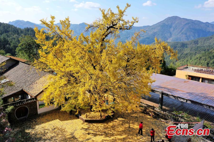 A 1,000-year-old ancient ginkgo tree stands out in a spectacular golden foliage, attracting tourists in Baokang county of Xiangyang, central China's Hubei Province, Oct. 31, 2022. (Photo: China News Service/Yang Dao)