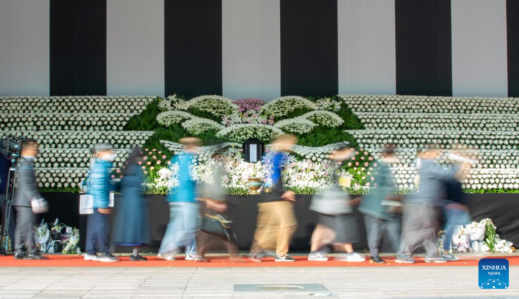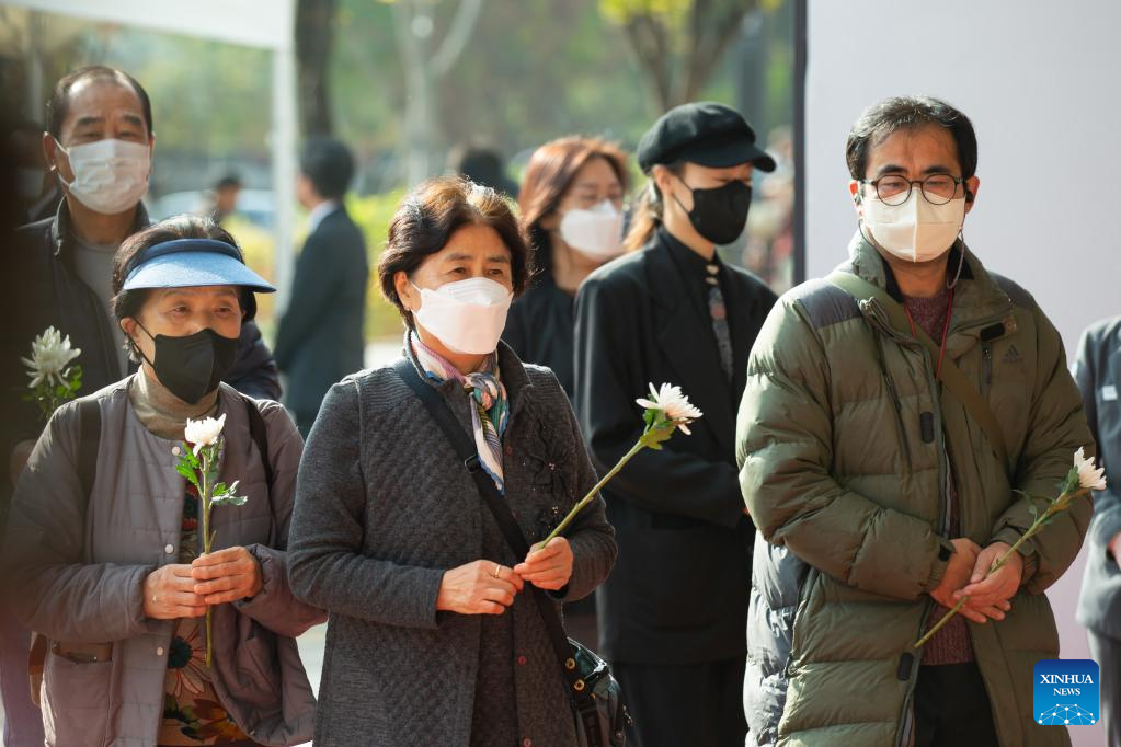 People holding flowers walk to a mourning altar set up at Seoul Plaza in Seoul, South Korea, Nov. 1, 2022. The death toll from a crowd crush, which occurred Saturday night at the Itaewon district of the South Korean capital Seoul during Halloween gatherings, rose overnight, the authorities said Tuesday. At least 156 people were killed and 151 others injured in the incident, according to the Ministry of the Interior and Safety. The government has announced a one-week national mourning period over the tragedy until Nov. 5. (Xinhua/Wang Yiliang)