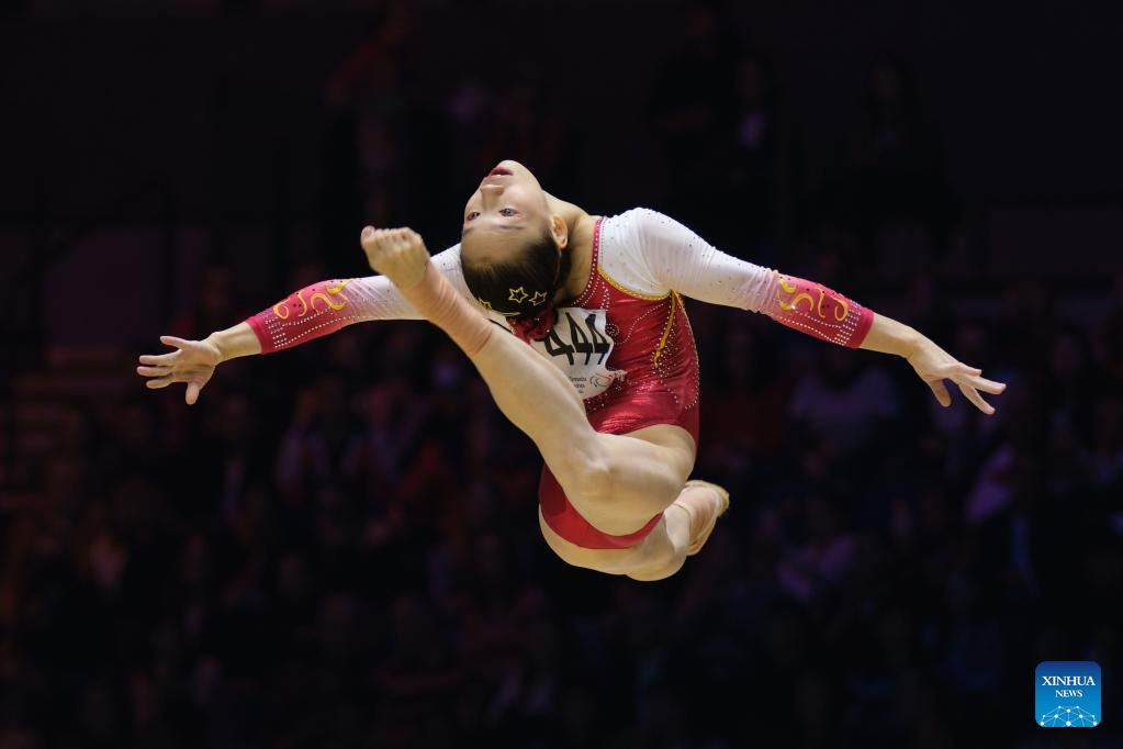 Ou Yushan of team China competes on the floor exercise of the women's team final at the 51st FIG Artistic Gymnastics World Championships in Liverpool, Britain, Nov. 1, 2022. (Xinhua/Meng Dingbo)