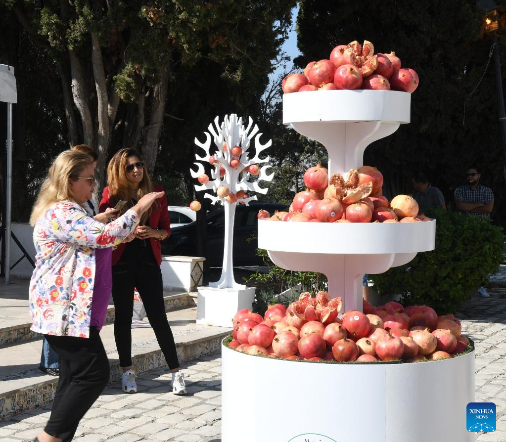 People look at pomegranates during a "pomegranate week" event showcasing harvested pomegranates and food made from pomegranates in Sidi Bou Said, north of Tunis, Tunisia on Nov. 1, 2022. (Photo by Adel Ezzine/Xinhua)