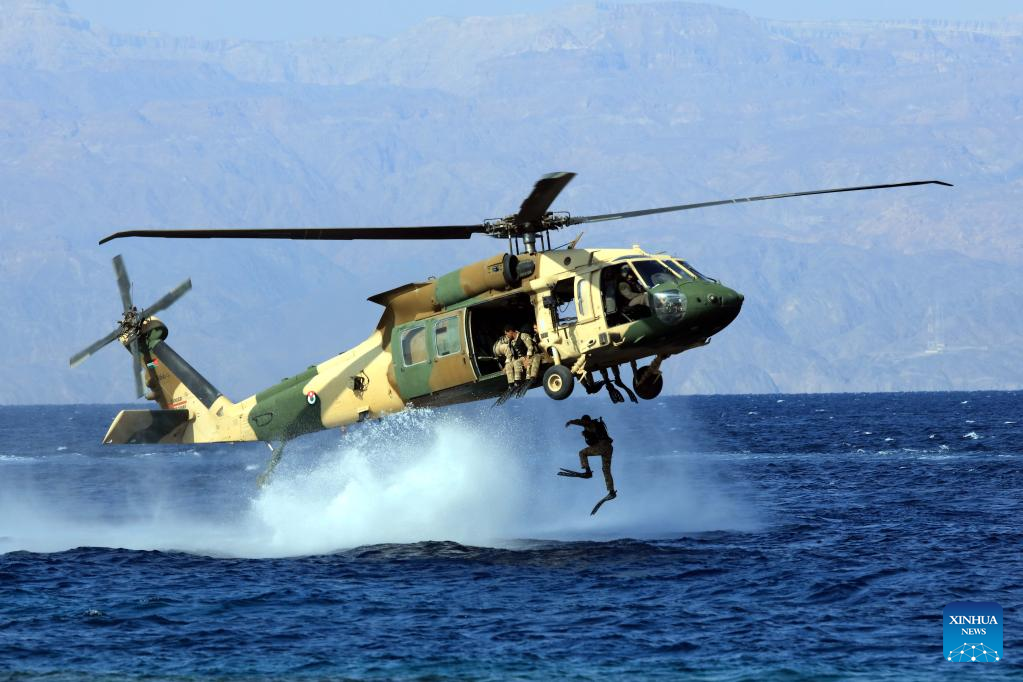 Jordanian special forces take part in a drill at the opening ceremony of the 13th Special Operations Forces Exhibition and Conference (SOFEX) in Aqaba, Jordan, on Nov. 1, 2022. The 13th Special Operations Forces Exhibition and Conference (SOFEX) kicked off in Jordan's Aqaba on Tuesday with the participation of more than 300 companies from 38 countries. (Photo by Mohammad Abu Ghosh/Xinhua)