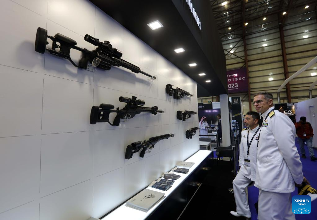 People attend the 13th Special Operations Forces Exhibition and Conference (SOFEX) in Aqaba, Jordan, on Nov. 1, 2022. The 13th Special Operations Forces Exhibition and Conference (SOFEX) kicked off in Jordan's Aqaba on Tuesday with the participation of more than 300 companies from 38 countries. (Photo by Mohammad Abu Ghosh/Xinhua)