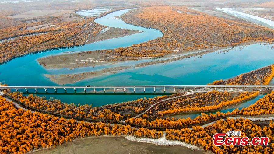 Stunning autumn scenery of desert poplar trees, also known as populus euphratica, along the Tarim River in Xayar County, northwest China's Xinjiang Uyghur Autonomous Region. Covering an area of nearly 313,333 hectares, the golden populus euphratica forest in Xayar County brings vitality to the arid desert. (Photo: China News Service/Liu Yuzhu)