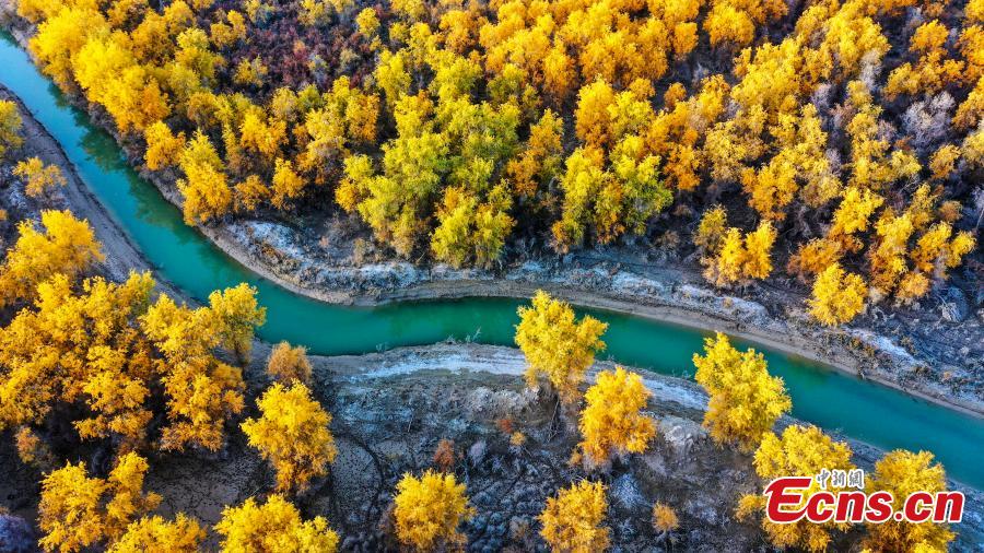 Stunning autumn scenery of desert poplar trees, also known as populus euphratica, along the Tarim River in Xayar County, northwest China's Xinjiang Uyghur Autonomous Region. Covering an area of nearly 313,333 hectares, the golden populus euphratica forest in Xayar County brings vitality to the arid desert. (Photo: China News Service/Liu Yuzhu)