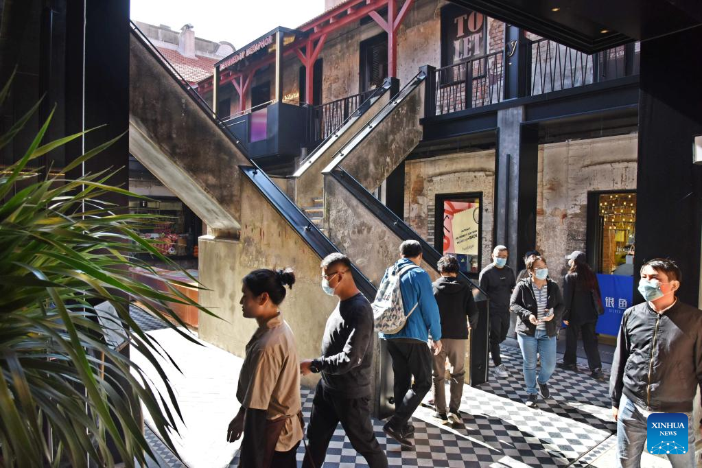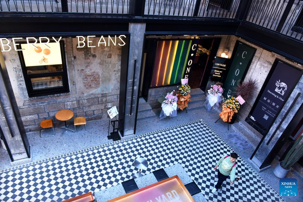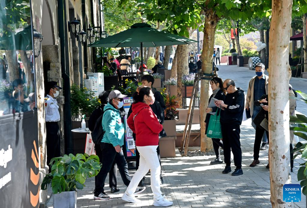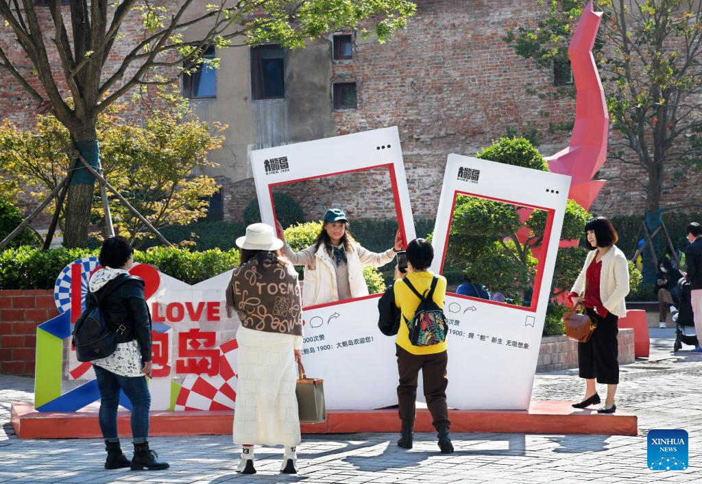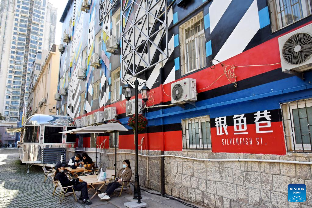 Visitors are seen at Silverfish ST. in Qingdao, east China's Shandong Province, Nov. 1, 2022. In recent years, the old city area of Qingdao has started protective renovation of its historical and cultural communities, during which ancient buildings have been maintained and new industries and trades have brought vitality to the city. (Xinhua/Li Ziheng)