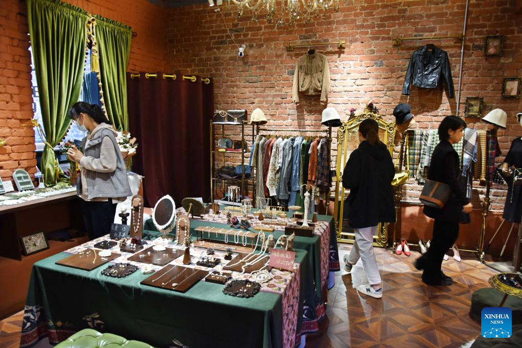 People select goods at a newly opened shop at Silverfish ST. in Qingdao, east China's Shandong Province, Nov. 1, 2022. In recent years, the old city area of Qingdao has started protective renovation of its historical and cultural communities, during which ancient buildings have been maintained and new industries and trades have brought vitality to the city. (Xinhua/Li Ziheng)