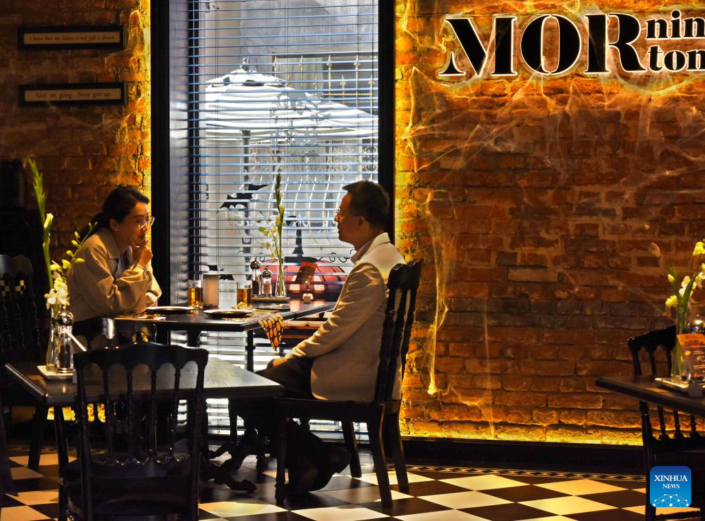 Customers are seen in a restaurant at Silverfish ST. in Qingdao, east China's Shandong Province, Nov. 1, 2022. In recent years, the old city area of Qingdao has started protective renovation of its historical and cultural communities, during which ancient buildings have been maintained and new industries and trades have brought vitality to the city. (Xinhua/Li Ziheng)
