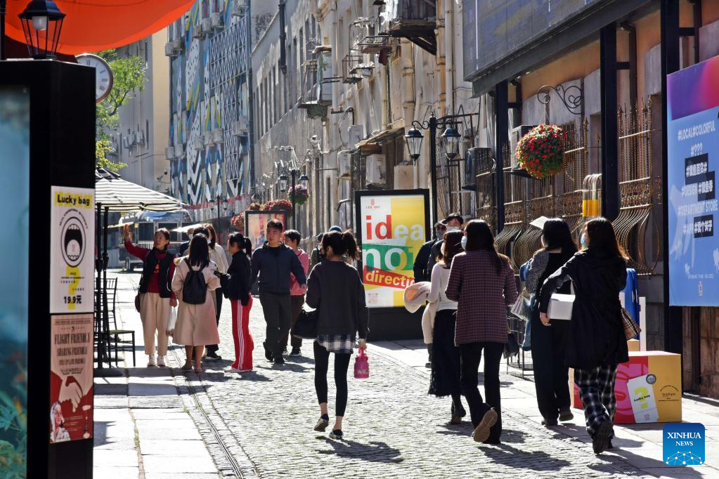 People visit at the Dabaodao blocks in Qingdao, east China's Shandong Province, Oct. 19, 2022. In recent years, the old city area of Qingdao has started protective renovation of its historical and cultural communities, during which ancient buildings have been maintained and new industries and trades have brought vitality to the city. (Xinhua/Li Ziheng)
