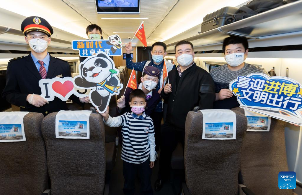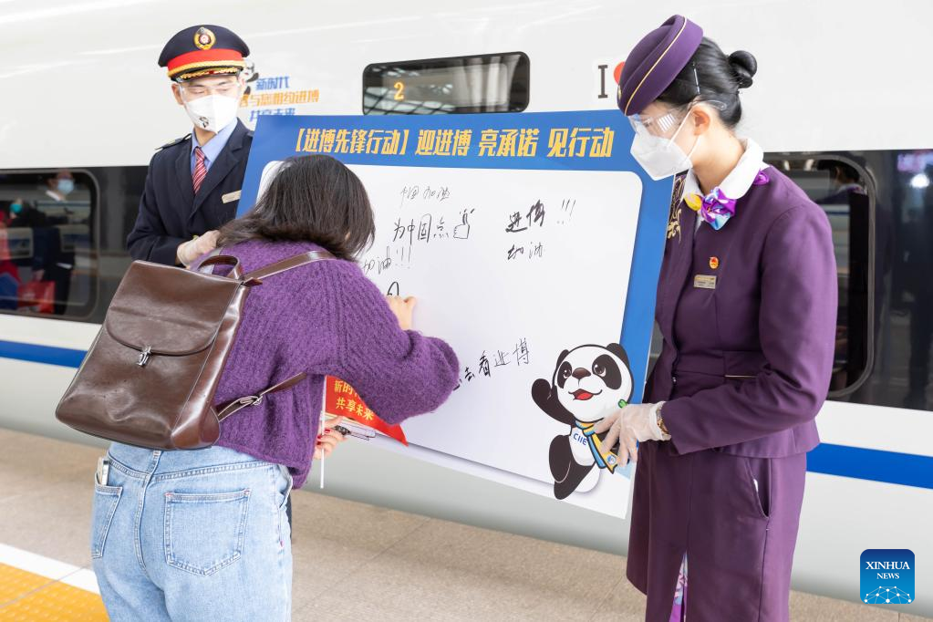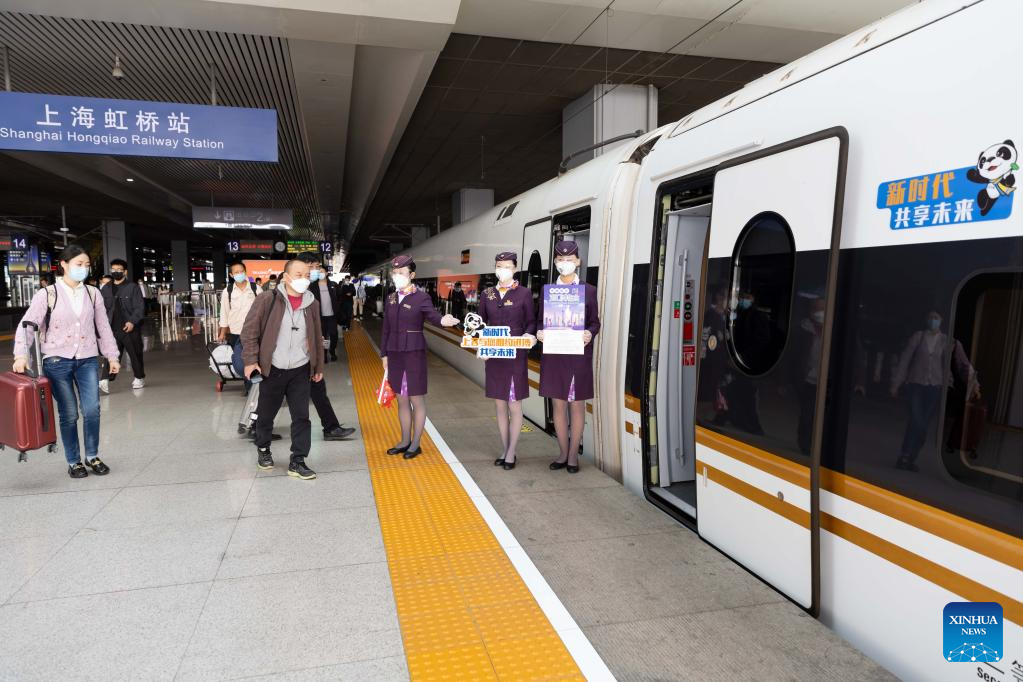 Stewardesses promote the upcoming fifth China International Import Expo (CIIE) to passengers boarding the G1724 train in east China's Shanghai, Nov. 2, 2022. The fifth CIIE will be held in Shanghai from Nov. 5 to 10. (Xinhua/Wang Xiang)