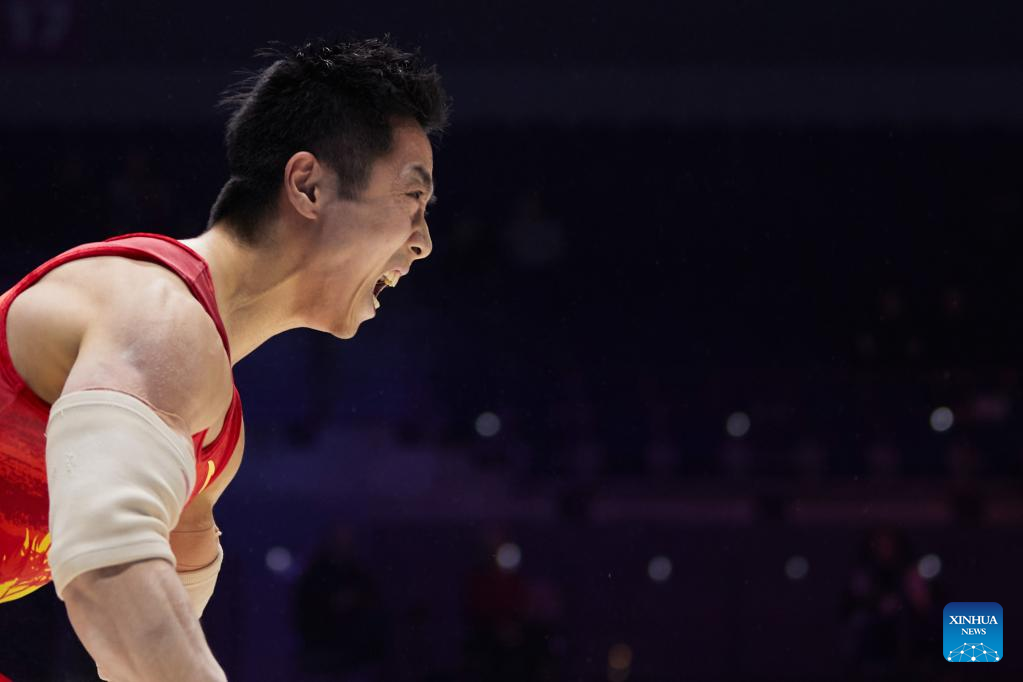 You Hao of team China celebrates after the parallel bars competition of the men's team final at the 51st FIG Artistic Gymnastics World Championships in Liverpool, Britain, Nov. 2, 2022. (Xinhua/Meng Dingbo)