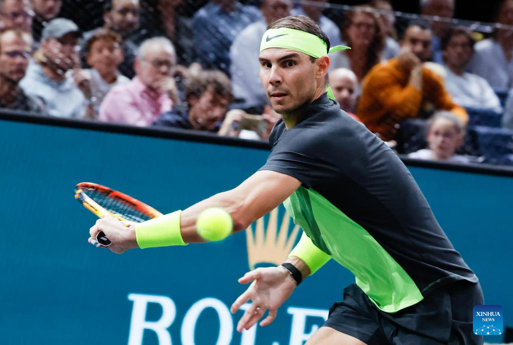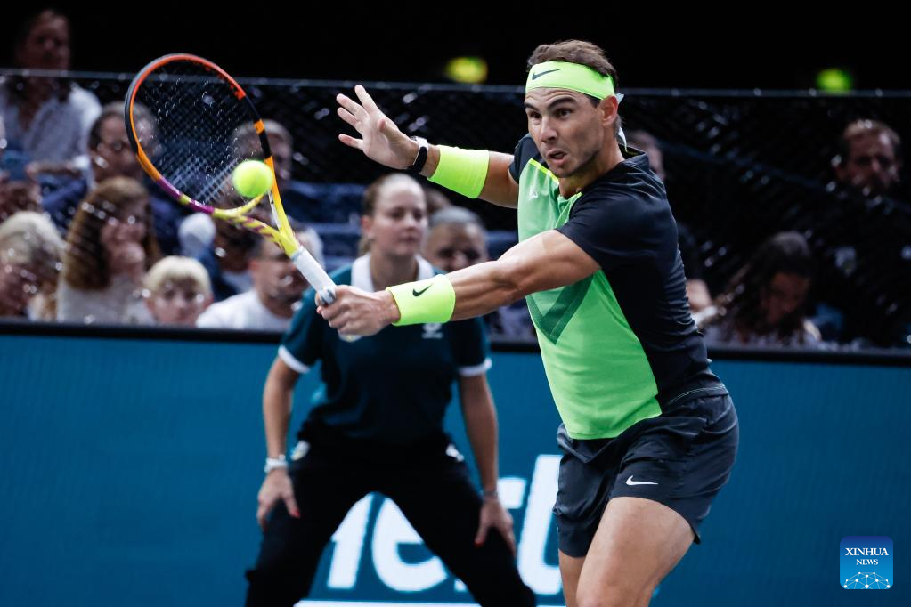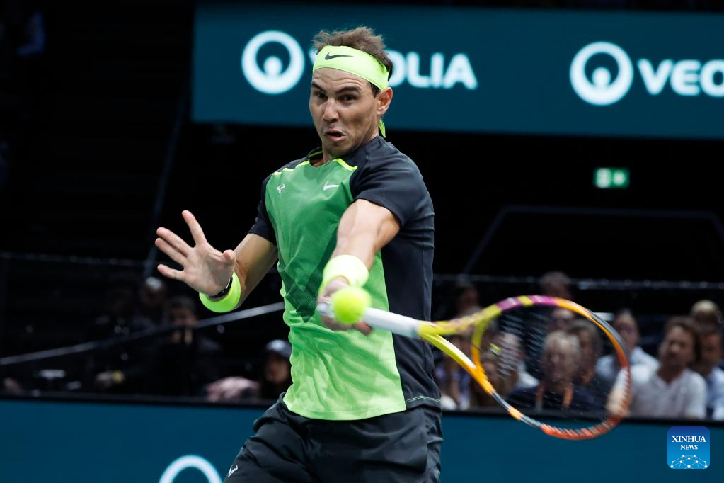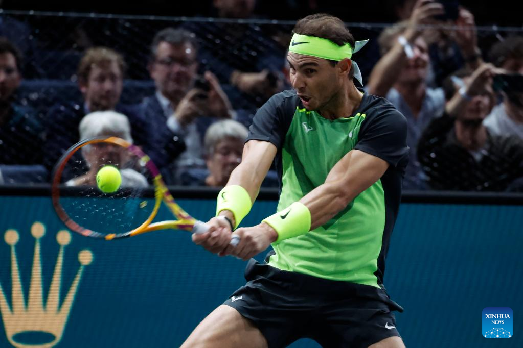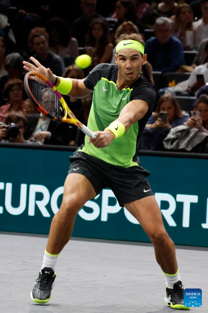 Rafael Nadal of Spain returns the ball during the men's singles second round match against Tommy Paul of the United States at the Rolex Paris Masters tennis tournament in Paris, France, Nov. 2, 2022. (Photo by Rit Heize/Xinhua)