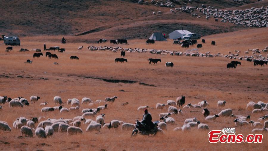 Herders drive livestock on the way to winter pastures in Dulan County, Haixi Mongolian-Tibetan autonomous prefecture, northwest China's Qinghai Province, Nov. 2, 2022. (Photo: China News Service/Xian Gong)