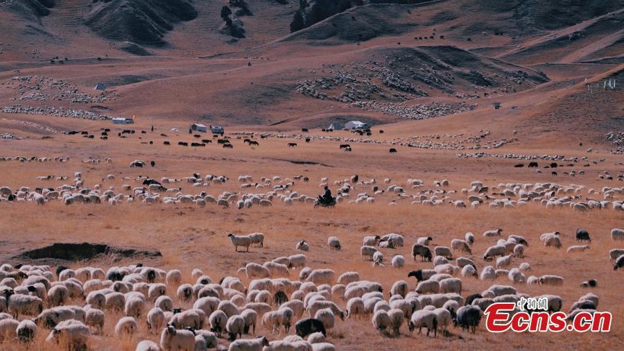 Herders drive livestock on the way to winter pastures in Dulan County, Haixi Mongolian-Tibetan autonomous prefecture, northwest China's Qinghai Province, Nov. 2, 2022. (Photo: China News Service/Xian Gong)