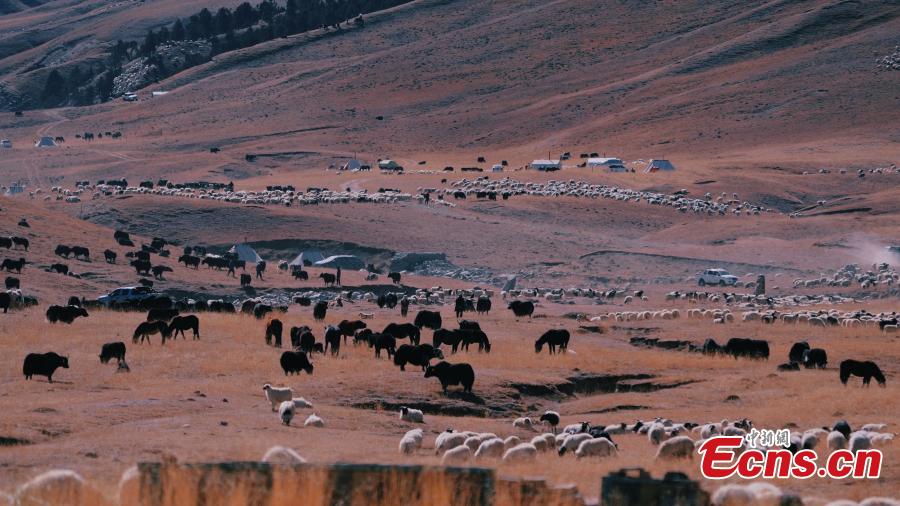 Herders drive livestock on the way to winter pastures in Dulan County, Haixi Mongolian-Tibetan autonomous prefecture, northwest China's Qinghai Province, Nov. 2, 2022. (Photo: China News Service/Xian Gong)
