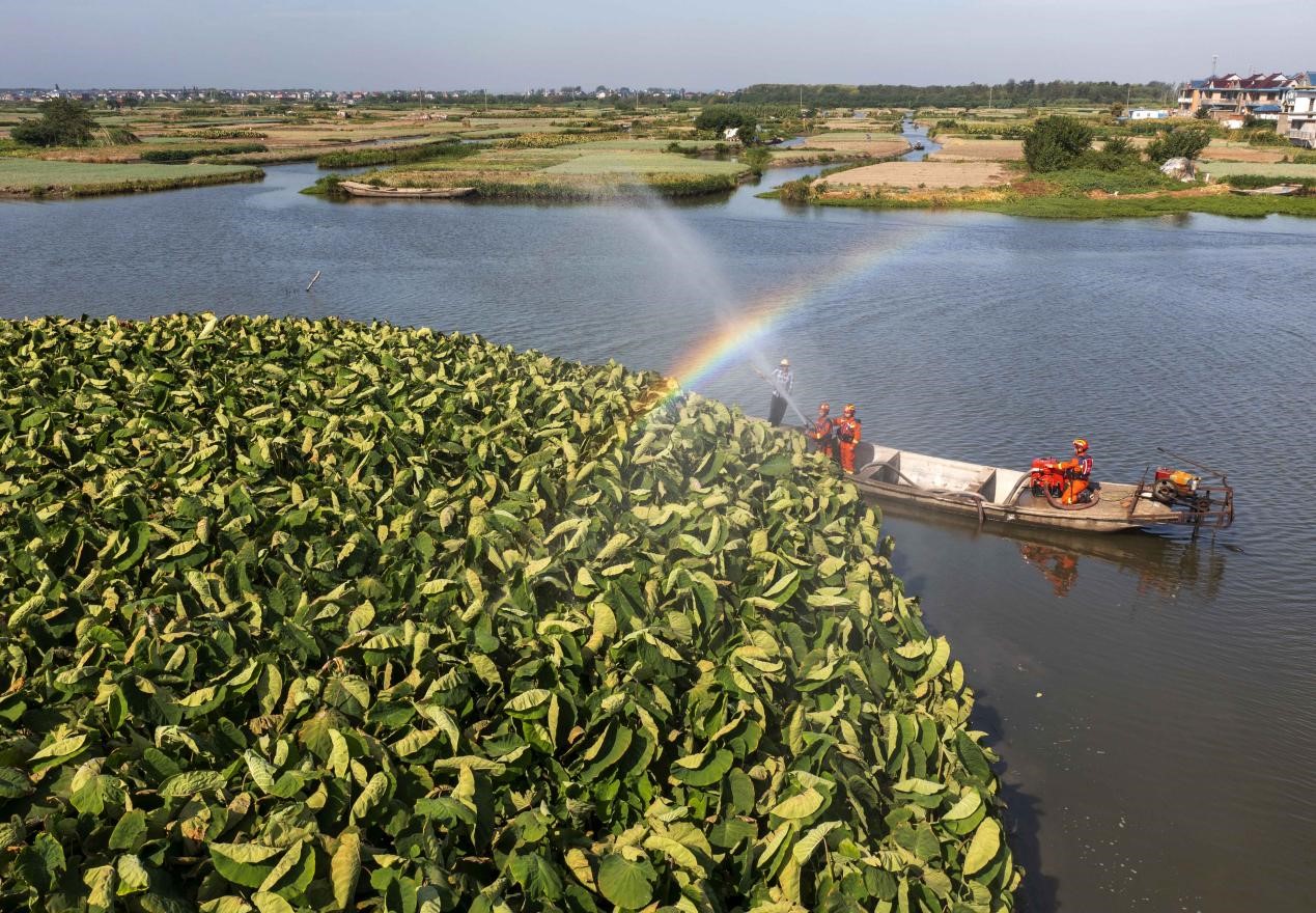 Firemen water Longxiang taro for villagers in Gaojiadang village, Xinghua, east China's Jiangsu province, Aug. 15, 2022. (People's Daily Online/Tang Dehong)