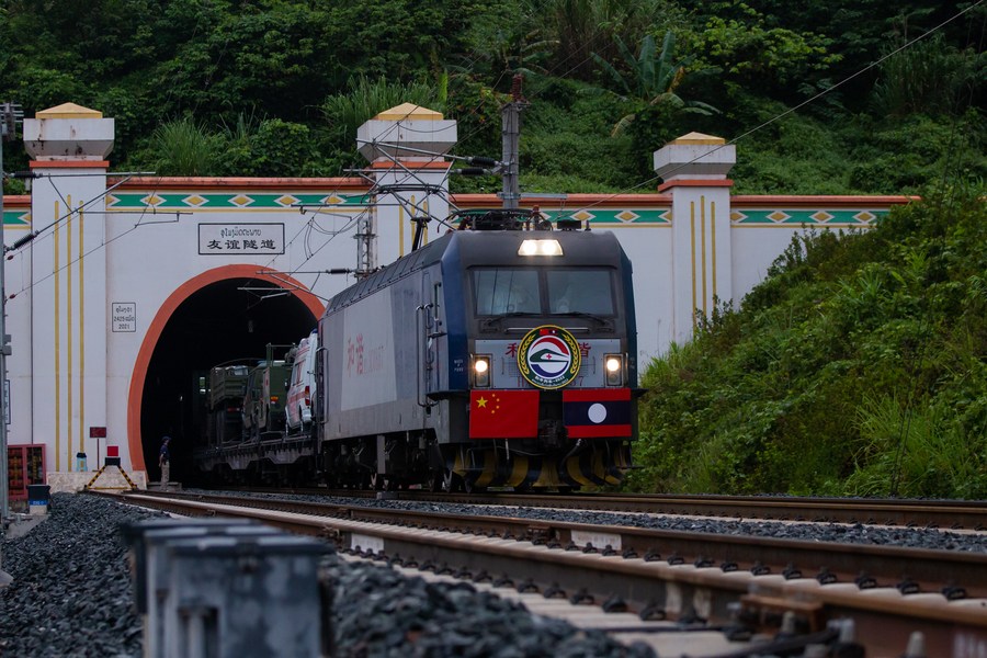 The medical train of the People's Liberation Army of China crosses the border with Laos by running through the Friendship Tunnel of China-Laos Railway, and arrives in the border town of Boten in Laos on July 19, 2022. (Photo by Kaikeo Saiyasane/Xinhua)