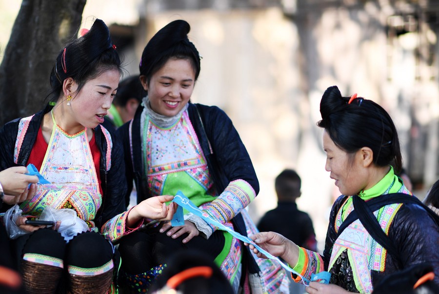 Women of the Miao ethnic group study embroidery at the workshop in Basha Village of the Miao ethnic group of Congjiang County, southwest China's Guizhou Province, Nov. 13, 2020. (Xinhua/Yang Wenbin)