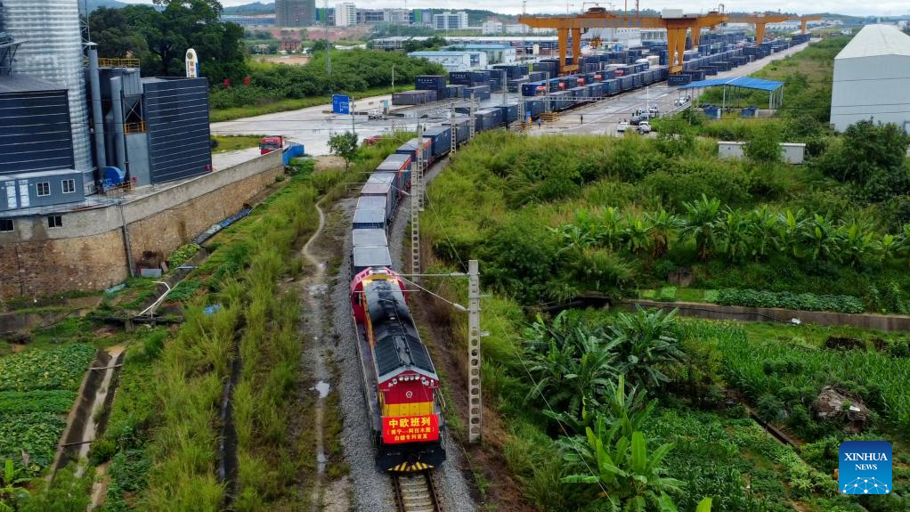 This aerial photo taken on May 15, 2022 shows a China-Europe freight train departing from Nanning, south China's Guangxi Zhuang Autonomous Region. In the first ten months of this year, the New International Land-Sea Trade Corridor saw 621,026 TEU containers transported by the railway intermodal freight trains, up 19.7 percent year on year. (Xinhua/Zhang Ailin)