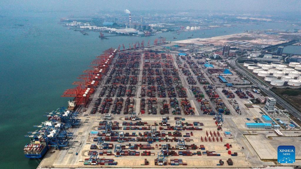 This aerial photo taken on Nov. 3, 2022 shows a view of Qinzhou Port in Qinzhou, south China's Guangxi Zhuang Autonomous Region. In the first ten months of this year, the New International Land-Sea Trade Corridor saw 621,026 TEU containers transported by the railway intermodal freight trains, up 19.7 percent year on year. (Xinhua/Zhang Ailin)