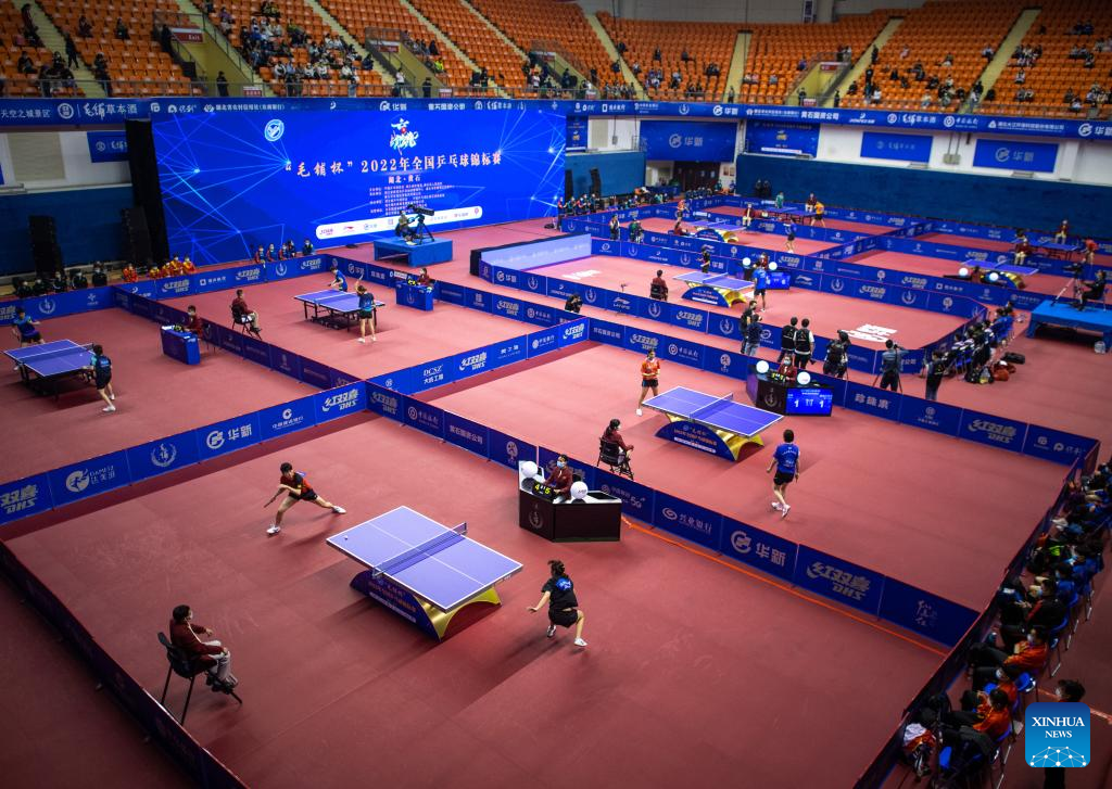 Photo taken on Nov. 3, 2022 shows team competitions of the 2022 Chinese National Table Tennis Championships in Huangshi, central China's Hubei Province. (Xinhua/Xiao Yijiu)