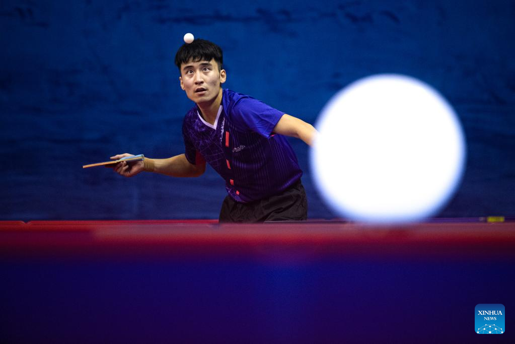 Niu Guankai of Henan serves during the men's team match against Li Zhiyi of Jiangxi at the 2022 Chinese National Table Tennis Championships in Huangshi, central China's Hubei Province, Nov. 3, 2022. (Xinhua/Xiao Yijiu)