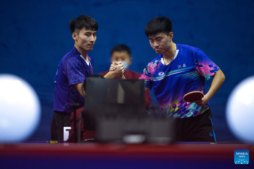Niu Guankai (L) of Henan greets Li Zhiyi of Jiangxi after their men's team match at the 2022 Chinese National Table Tennis Championships in Huangshi, central China's Hubei Province, Nov. 3, 2022. (Xinhua/Xiao Yijiu)
