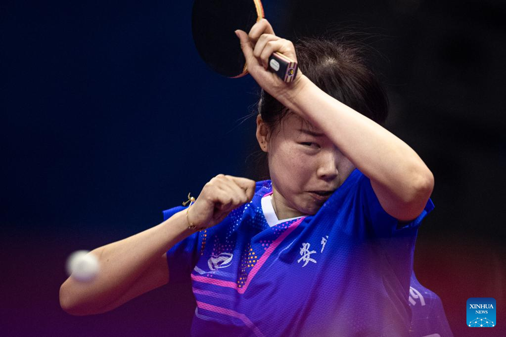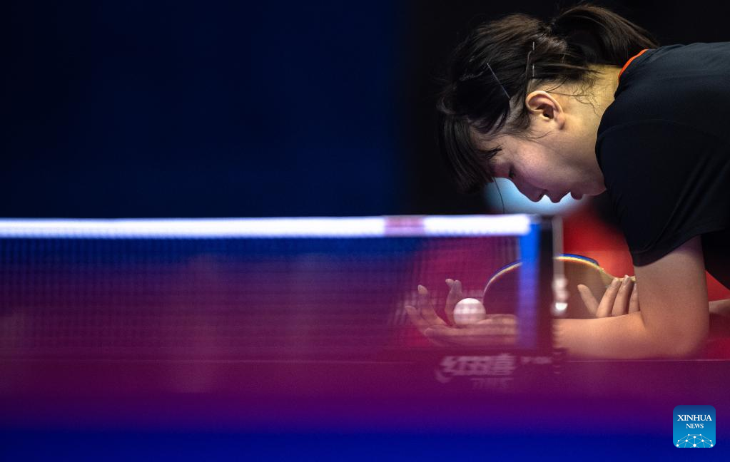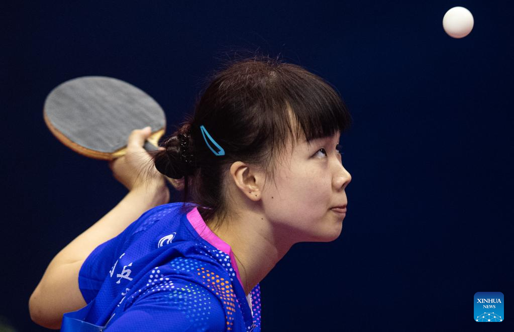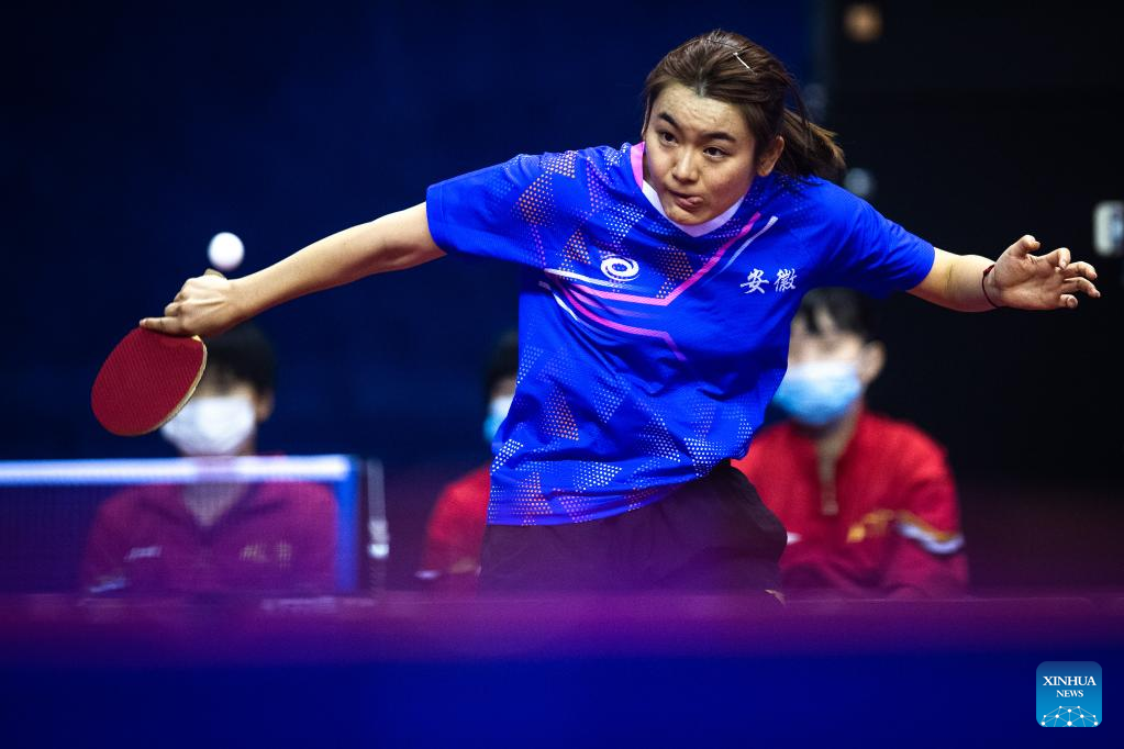 Liu Fei of Anhui returns the ball during the women's team match against Li Yake of Beijing at the 2022 Chinese National Table Tennis Championships in Huangshi, central China's Hubei Province, Nov. 3, 2022. (Xinhua/Xiao Yijiu)