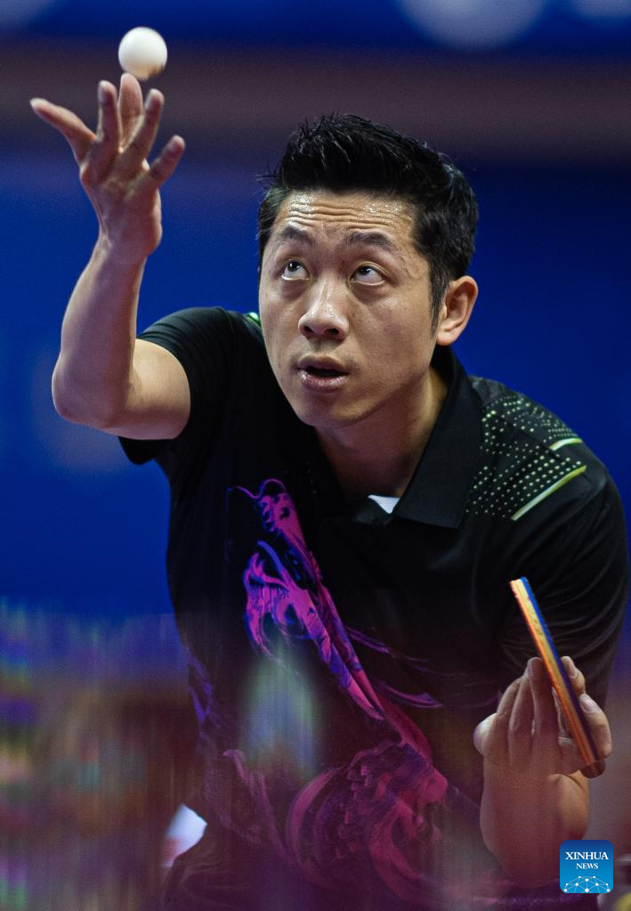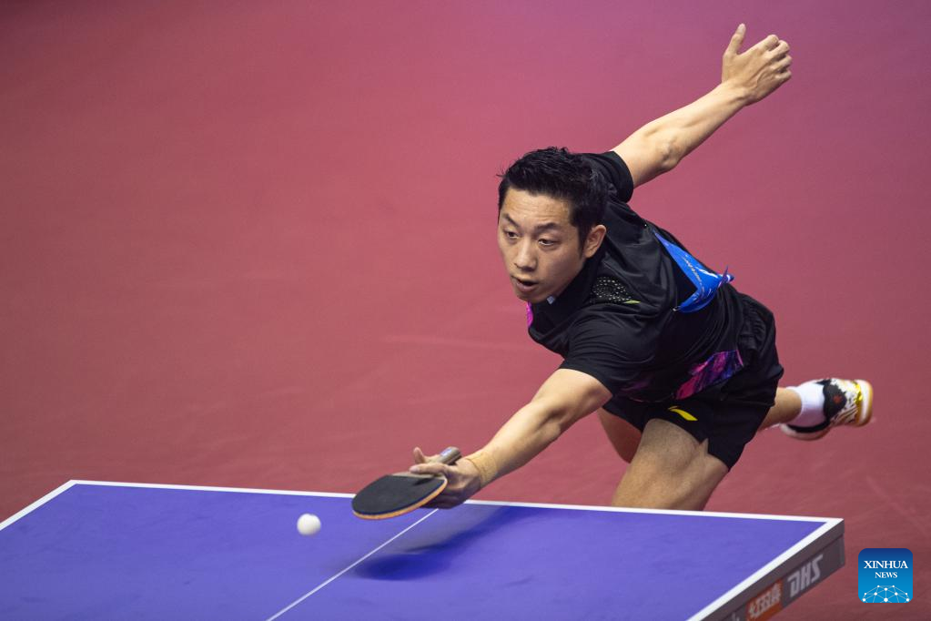 Xu Xin of Shanghai returns the ball during the men's team match against Xie Yunxi of Guangxi at the 2022 Chinese National Table Tennis Championships in Huangshi, central China's Hubei Province, Nov. 3, 2022. (Xinhua/Xiao Yijiu)